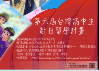 本協會招募台灣高中生赴日本高中留學約11個月,除了可以和日本學生在同一個環境下學習,也能體驗日本的高中生活、並學習日本社會、文化、歷史。▎留學期間:2022年8月下旬~2023年7月下旬(予定)▎招募對象:台灣所有公私立高中、五年制專科的一、二年級在學學生。▎留學地點:由本協會指定之日本普通高中其主要為超級全球高中(Super Global High School, SGH)指定校,或是和台灣高中有姊妹校關係之學校▎報名時間:即日起~2022年3月31日(四)為止相關申請方式及資訊請參閱官網,並至官網下載申請書。