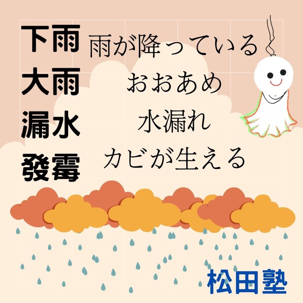 2/23 大雨大雨一直下每日更新 去年的冬天缺水。今年的冬天一直下雨阿!下雨下不停。來學些和下雨有關的日文吧~下雨 あめがふっている大雨 おおあめ漏水 水漏れ(みずもれ)發霉 カビが生える(はえる)快給我好天氣吧!てるてる坊主(てるてるぼうず)