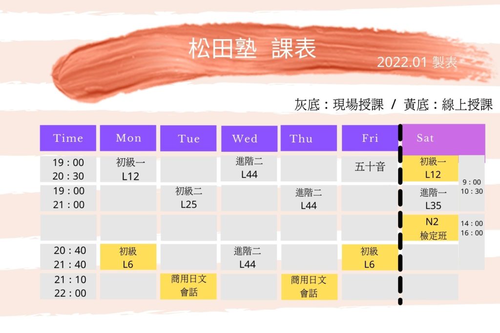 附上松田塾的上課課表。灰底的是現場授課。黃底的是線上授課。