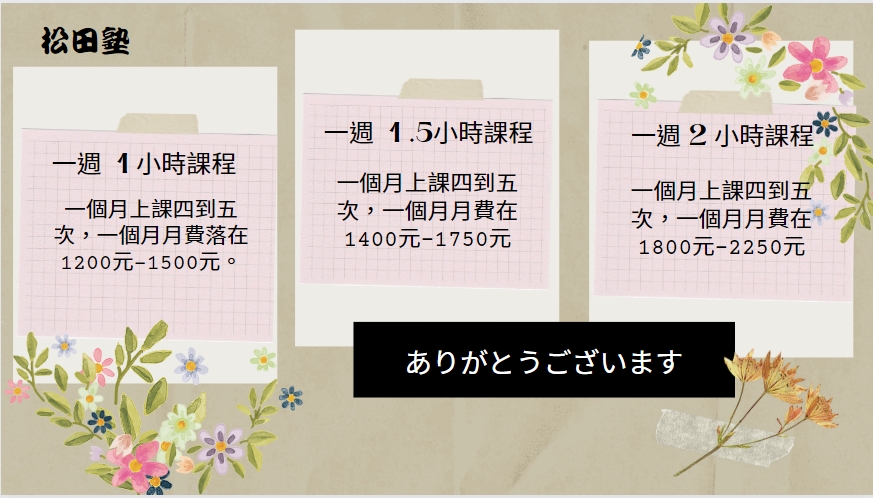 一週一堂課。1hr,300元/堂。1.5hr,350元/堂。2hr,450元/堂。